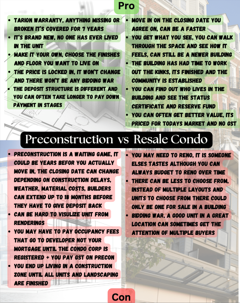 Higher Price: Preconstruction condos may be priced higher compared to resale units, even though you wonโt benefit from the property appreciating until itโs completed and occupied.
